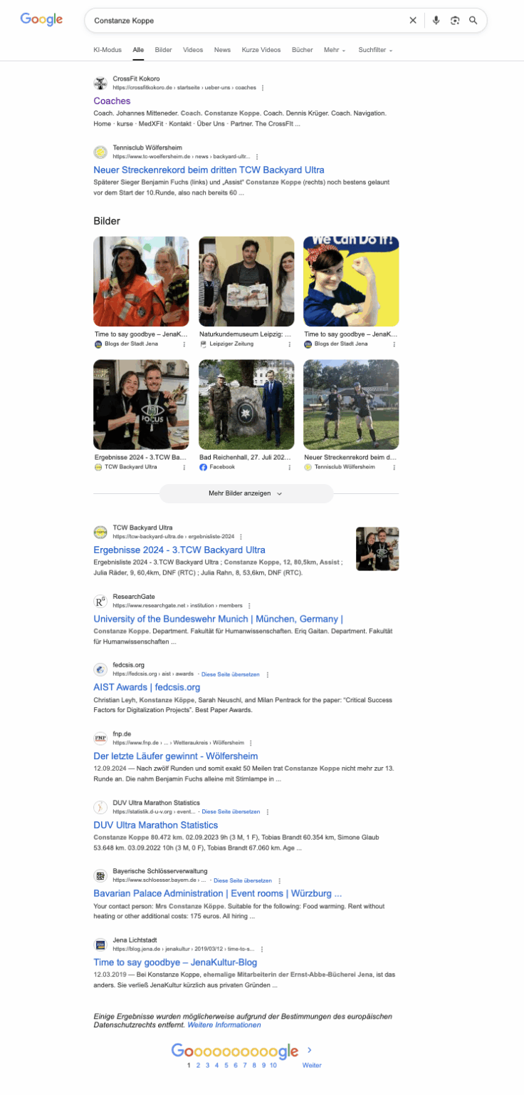 Stark fragmentiertes Bild. Das professionelle Profil (Wissenschaft) ist zwar vorhanden, wird aber massiv von Sportergebnissen (die evtl. zur selben Person gehören, aber keinen Business-Kontext bieten) und irrelevanten Namensvetterinnen überlagert. Eine klare berufliche Positionierung fehlt.