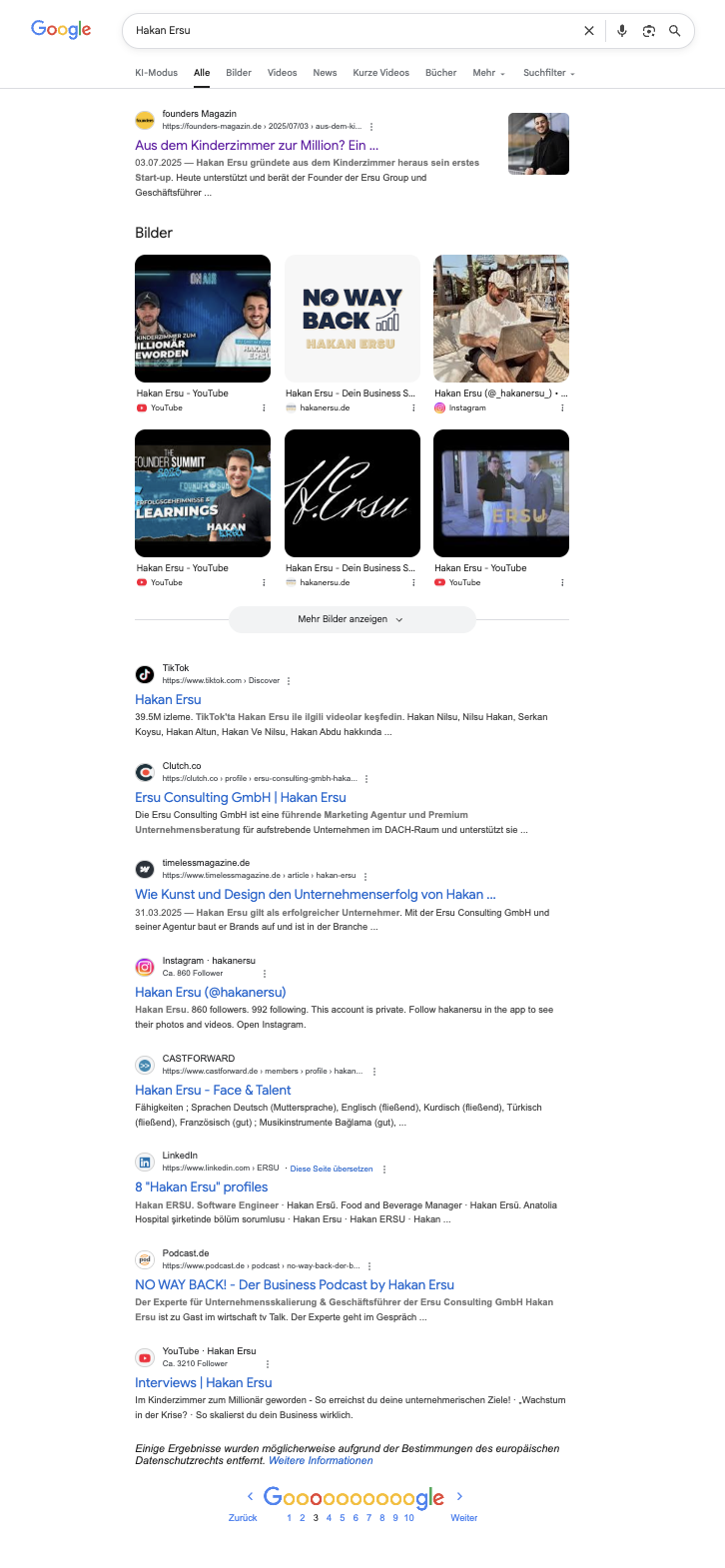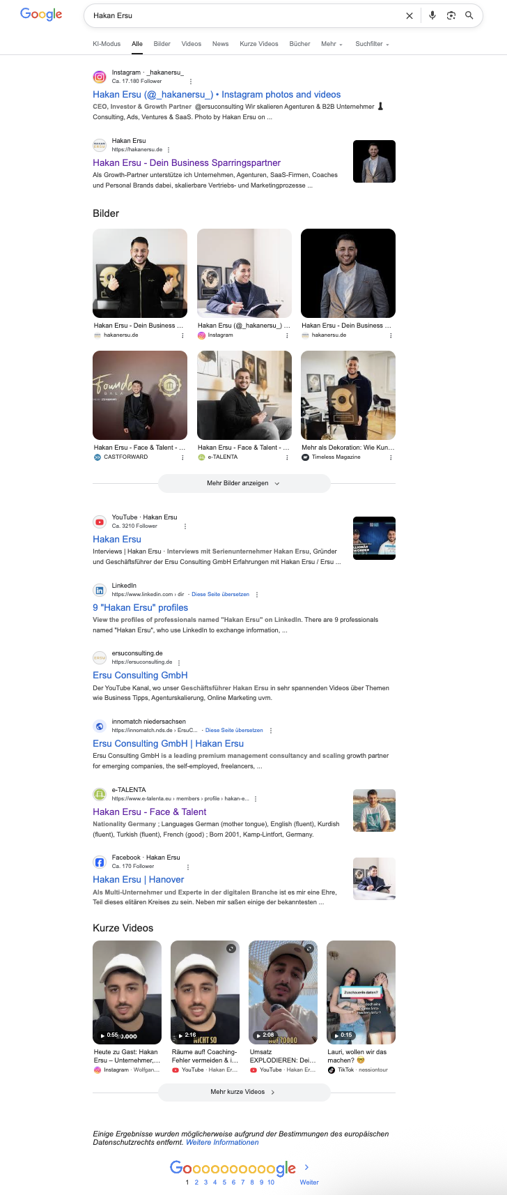 Außergewöhnlich starke und konsistente Präsenz über alle drei analysierten Suchergebnisseiten hinweg. Eine perfekte Mischung aus "Owned Media" (Social, Web) und hochwertiger "Earned Media" (Presse, Podcasts) dominiert die SERPs vollständig. Es gibt praktisch keine Verwässerung durch Namensvettern.