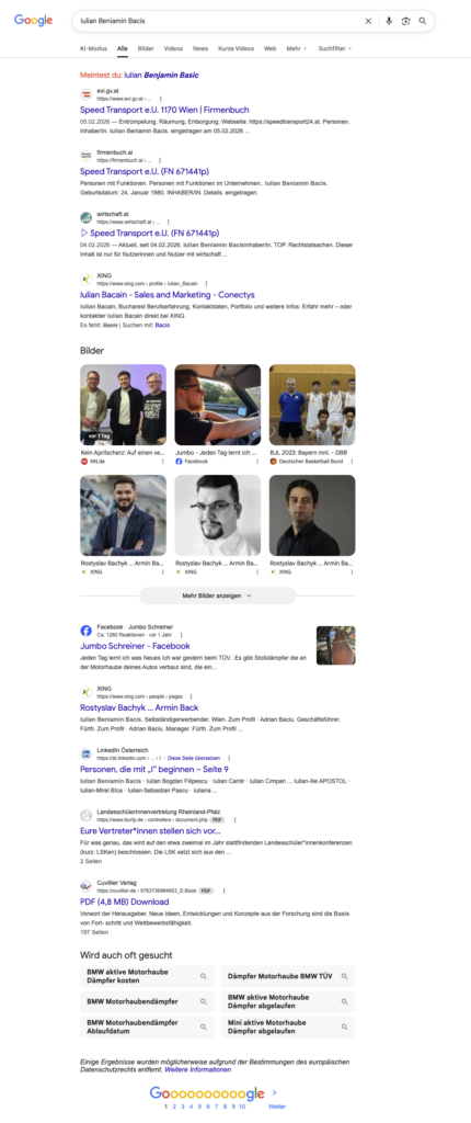 Unsere Auswertung zeigt ein massiv fragmentiertes Bild. Die einzige Verbindung zu "Speed Transport e.U." besteht aus trockenen, administrativen Registereinträgen. Es gibt keinerlei kontrollierte "Owned Media" (wie ein LinkedIn-Profil oder eine Webseiten-Biografie), die für diesen Namen ranken. Dies führt dazu, dass Google die Suchergebnisse mit völlig irrelevanten Inhalten (Wissenschaft, Namensähnlichkeiten) auffüllt, was zu einem erheblichen Trust-Gap führt.