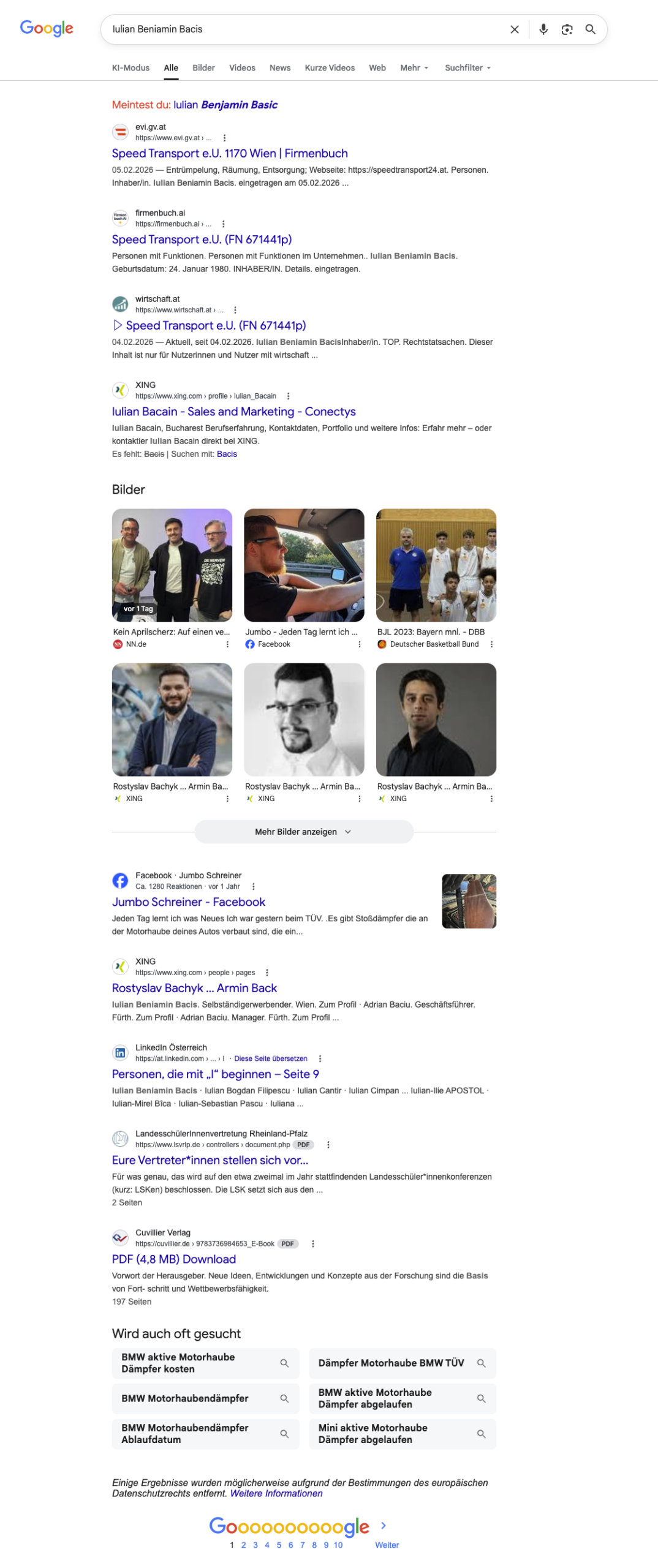Es rankt weder ein eigenes LinkedIn-Profil noch eine "Über uns"-Seite der Firmenwebsite (speedtransport24.at). Es gibt keinen digitalen Ankerpunkt.