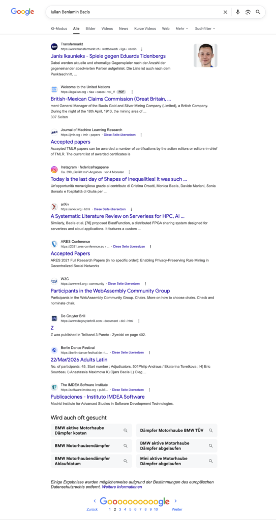 Viel Potenzial, extrem wenig Aufwand Die aktuelle Ausgangslage ist ein unbeschriebenes Blatt mit vielen Störsignalen. Das ist jedoch eine große Chance: Da es noch keine stark besetzte Konkurrenz um exakt diesen Namen gibt, lässt sich mit wenigen, aber sehr gezielten Maßnahmen (LinkedIn, Website-Update, gezielte PR) die komplette Seite 1 der Google-Suche innerhalb kurzer Zeit kontrollieren und bereinigen.