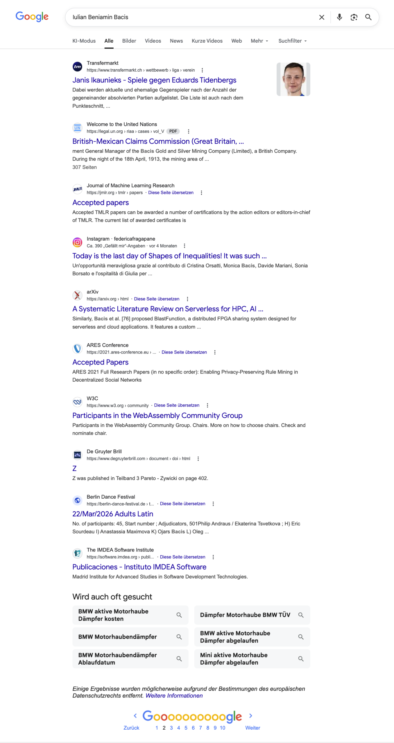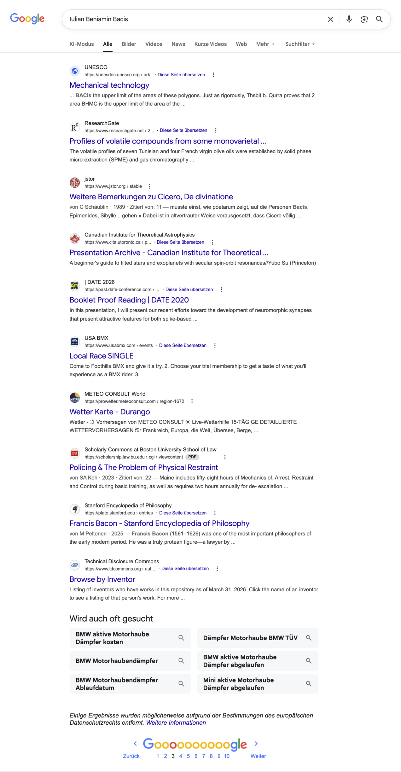 Die Algorithmen sind verwirrt. Google schlägt aktiv "Meintest du: Iulian Benjamin Basic" vor. Das System kann den Namen keiner klaren beruflichen Identität zuordnen und greift auf Namensbestandteile ("Bacis") zurück, um Ergebnisse zu füllen.