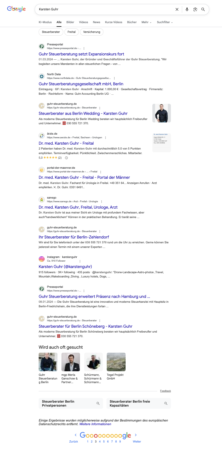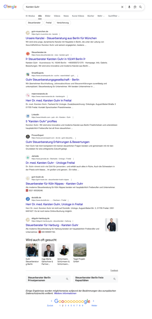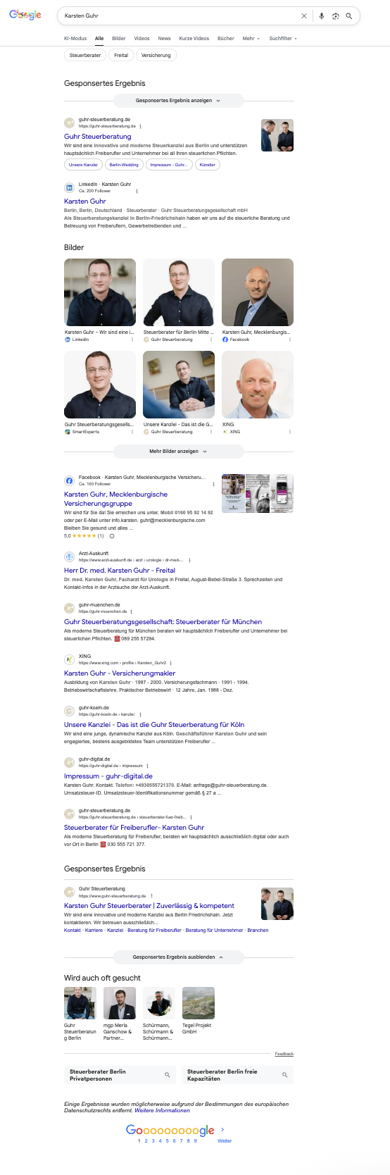 Versuch, ein Google Knowledge Panel für "Karsten Guhr (Steuerberater)" zu erzwingen (durch strukturierte Daten auf der Website), um optisch sofort Klarheit zu schaffen.